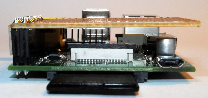 The RasPi is running on Debian wheezy and the perfboard is connected via two row header sockets to the GPIO pins.